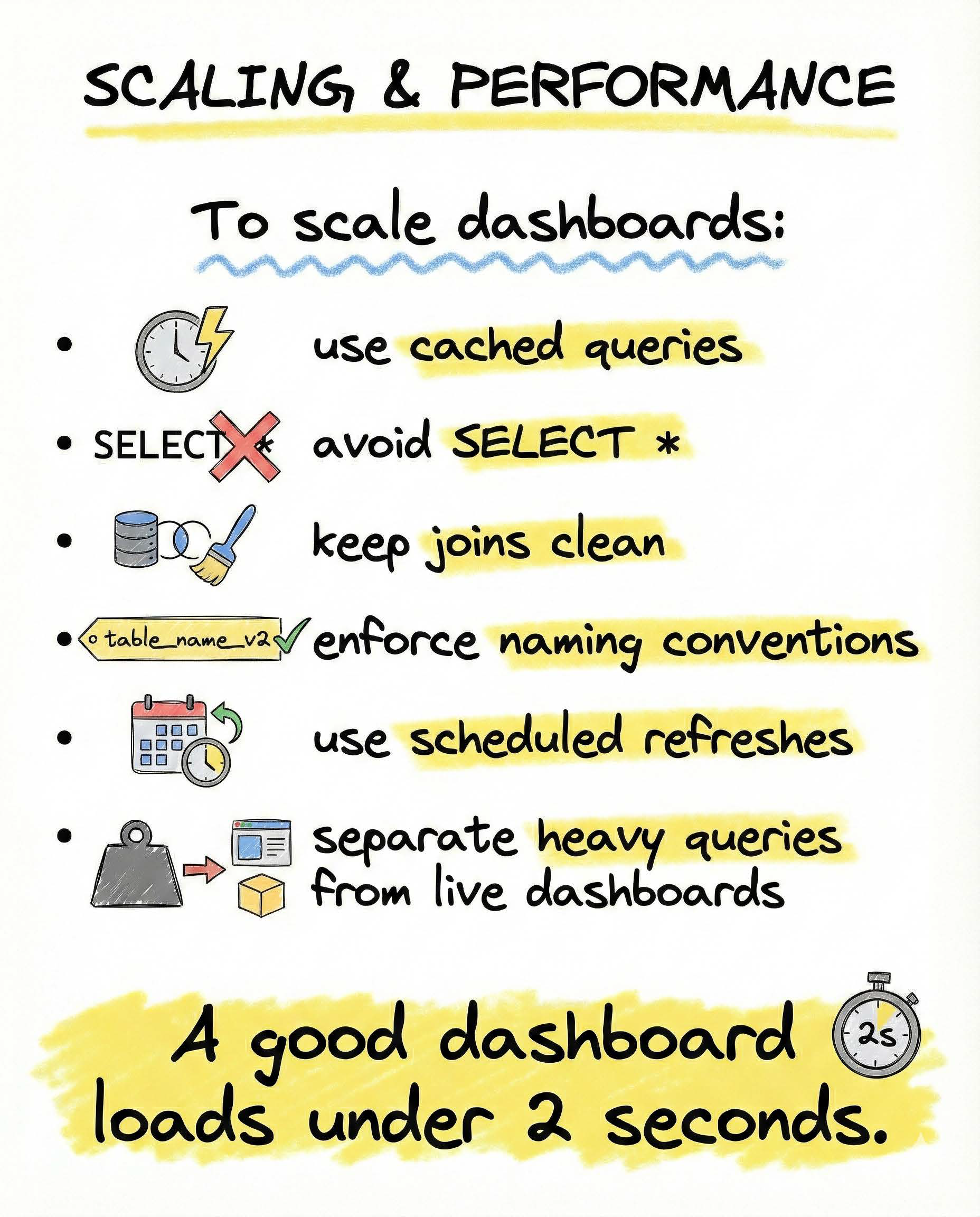 SELECT *in production dashboards - keep joins simple and intentional